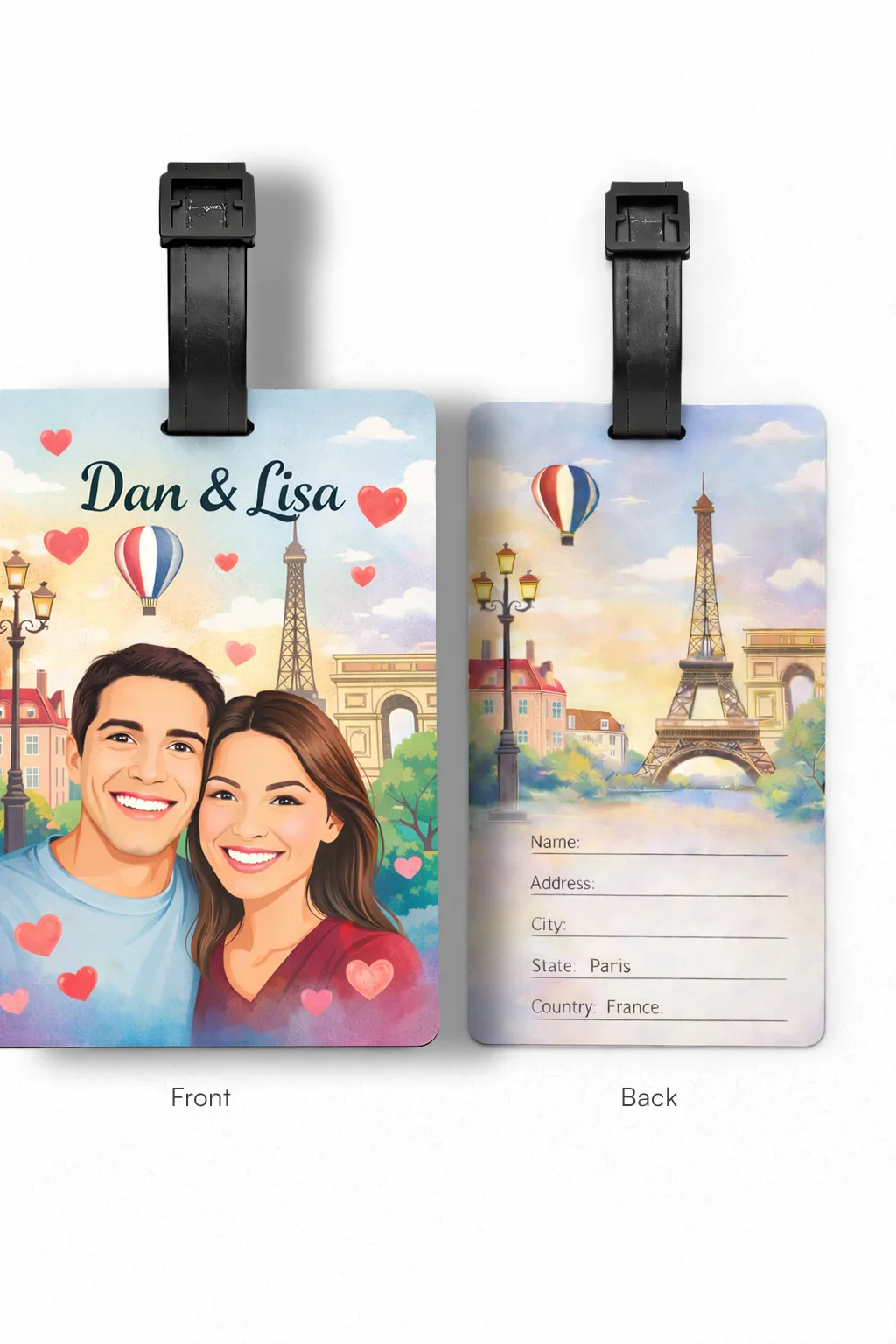 Each tag is custom printed on both sides, allowing you to add names, contact details, logos, photos, or unique designs. Crafted from sturdy MDF, this luggage tag is lightweight yet durable—perfect for frequent travelers.