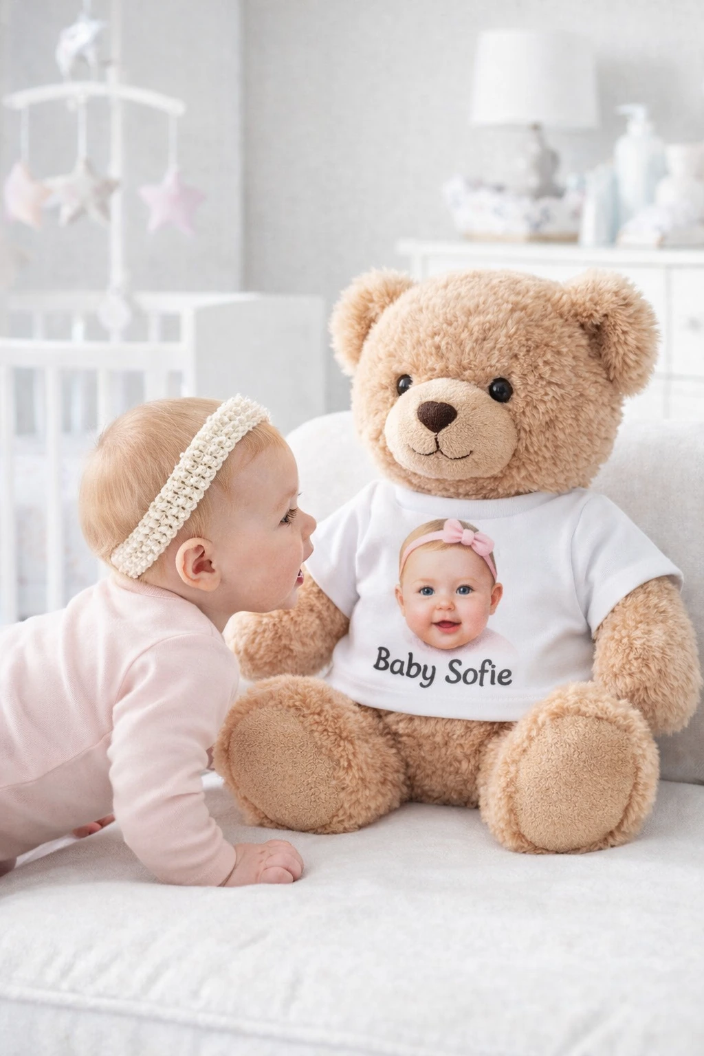 Some moments deserve a hug you can keep. This little teddy bear T-shirt turns any plush into a personal keepsake — perfect for announcing a name, celebrating a birth date, or dressing baby’s favorite cuddle buddy for photos. We personalize the front with your details in a clean, modern style and press the design so it stays bright through lots of snuggles. Pair it with a newborn swaddle, a memory box, or a nursery shelf and you’ve got a gift that feels thoughtful, not generic.